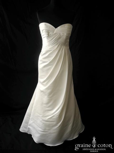 Robe une pièce en satin ivoire : bustier coeur drapé taille haute, dos boutonné. Jupe trapèze épurée avec traîne amovible. Pure et élégante. Housse incluse avec fermeture cassée.