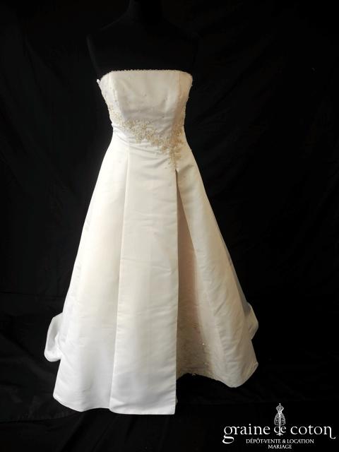 Robe une pièce en satin duchesse ivoire et rosé : bustier délicatement perlé de perles argentées et de toupies Swarovski cristal. Diagonale de guipure perlée. La jupe s’ouvre sur un pan perlé et se termine en longue traîne. Élégante et raffinée. Étole assortie et housse incluses.
