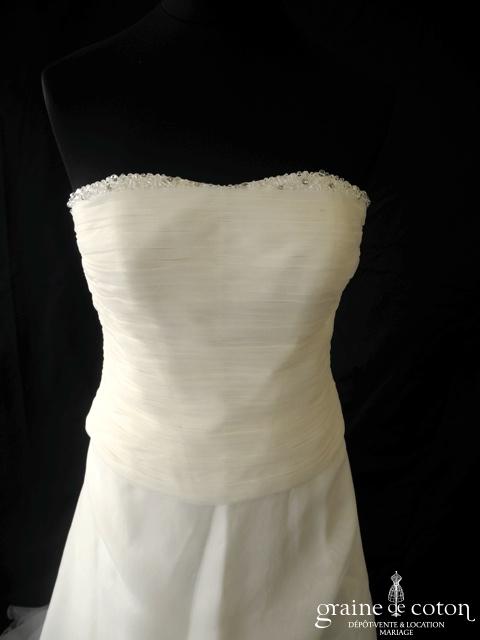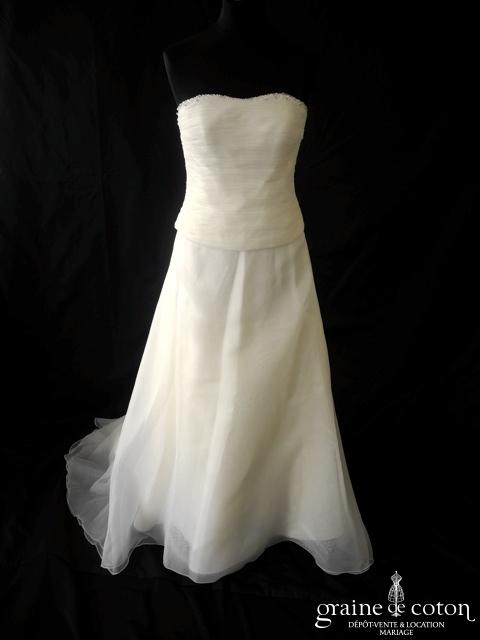 Robe deux pièces en organza ivoire : bustier drapé légèrement coeur, orné de perles le long du décolleté, dos lacé. Jupe fluide épurée en organza, petite traîne. Souple et seyante. Housse et jupon inclus.