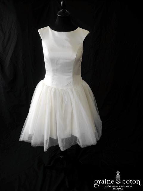 Robe une pièce ivoire clair : bustier en satin avec larges bretelles, décolleté rond. Jupe courte en tulle. Simple et efficace !