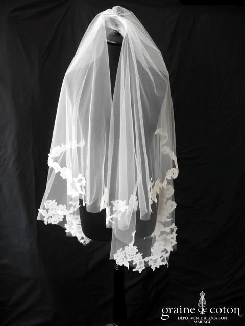 Voile mi long (aux cuisses) en tulle souple ivoire clair bordé d’une magnifique guipure de dentelle.