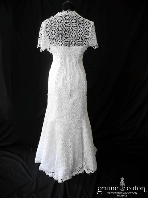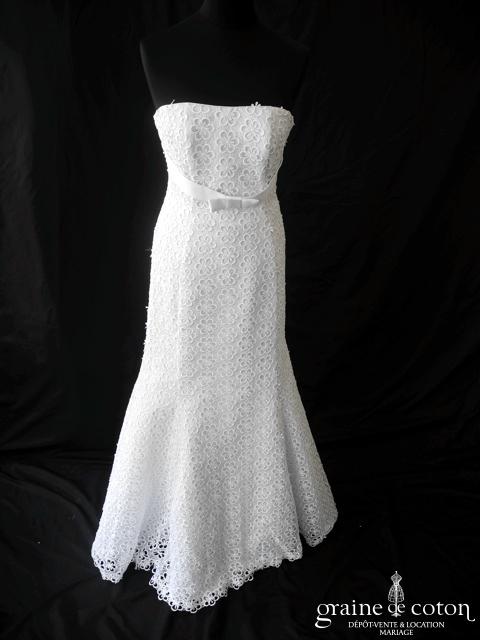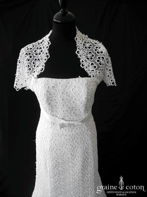Robe une pièce en dentelle crochetée blanche forme fleurs : décolleté coeur, taille empire soulignée d’une ceinture de satin, dos lacé. Jupe sirène ajustée sans traîne. Coupe moderne, silhouette longiligne. Boléro manches courtes assorti inclus.