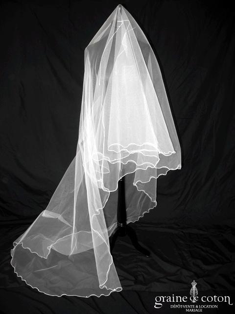 Voile long de 3 mètres en tulle blanc bordé de perles nacrées, bors surjeté. Non monté sur peigne, fronce préparée.