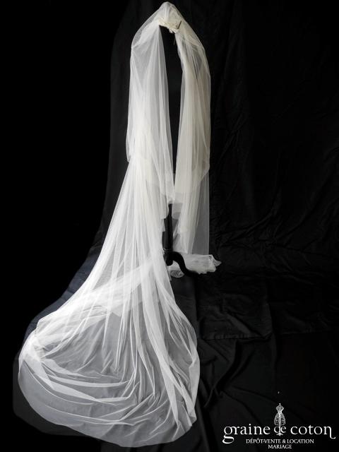 Voile long de 3 mètres en tulle de soie ivoire clair, monté sur peigne, avec rabat avant.