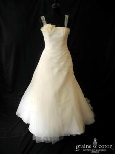 Robe une pièce en soie doublée d’organza ivoire : bustier drapé orné d’une fleur en tissu qui peut se retirer, bretelles en tulle amovibles également. Jupe taille basse évasée en tulle et organza, petite traîne. Légère, élégante et longiligne. Housse et jupon inclus.