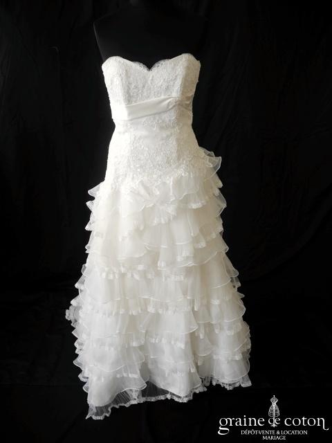 Robe une pièce ivoire clair : bustier en dentelle avec taille empire soulignée d’une ceinture de satin, dos lacé. Jupe taille basse avec volants d’organza bordés de dentelle, petite traîne. Légère, classe, belle ligne. Housse incluse.
