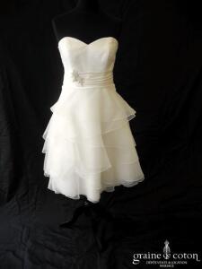 Robe une pièce courte ivoire clair : bustier coeur en satin et jupe en volants d’organza. Ceinture avec barrette de strass. Classe et légère, idéale pour une cérémonie civile.