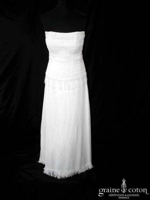 Robe deux pièces ivoire clair : bustier en guipure de dentelle de coton, lacé dans le dos. Jupe fluide en tulle avec la même guipure sur l’ourlet. Sobre, travaillée et élégante.