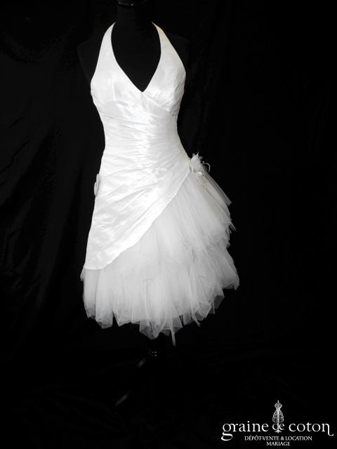 Robe courte une pièce : bustier en taffetas drapé avec tour de cou, fleur en tissu à la taille. jupe courte s’ouvrant sur un jupon en mouchoirs de tulle. Idéale pour une cérémonie civile.