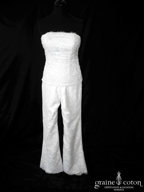 Ensemble deux pièces en guipure de dentelle ivoire clair : bustier tout en dentelle rebrodée de perles, dos boutonné. Pantalon en dentelle. Original, idéal pour une cérémonie civile.