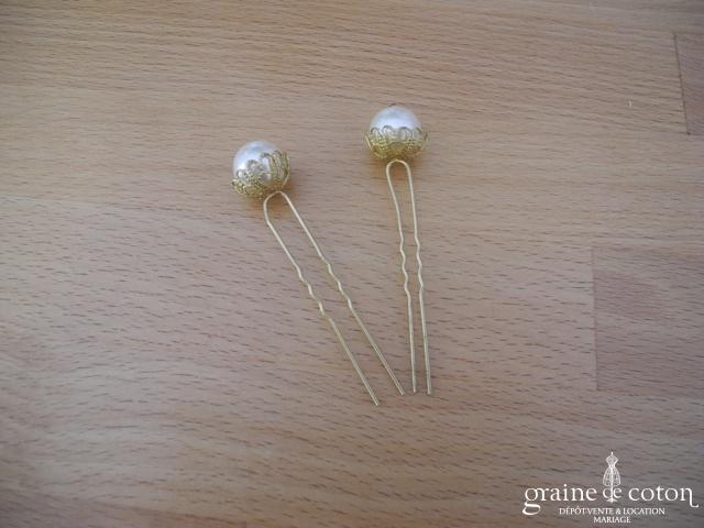 Lot de 2 pics à cheveux perle ivoire et doré.