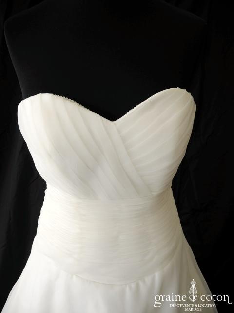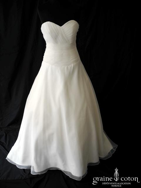Robe une pièce en organza ivoire clair : bustier coeur drapé, lacé dans le dos, avec bretelles amovibles fournies. Jupe trapèze épurée tout en organza avec traîne. Sobre et seyante. Housse et jupon inclus. Boléro idéalement assorti disponible sous la référence 3033.