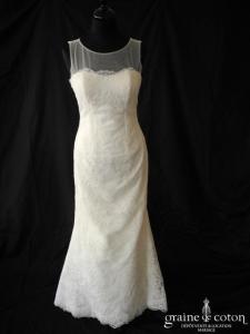 Robe une pièce en dentelle ivoire : bustier avec bretelles de tulle couvrant le décolleté. Jupe sirène sans traîne. Classe et épurée, belle dentelle. Housse incluse.