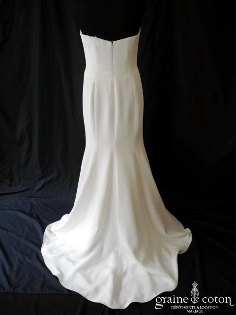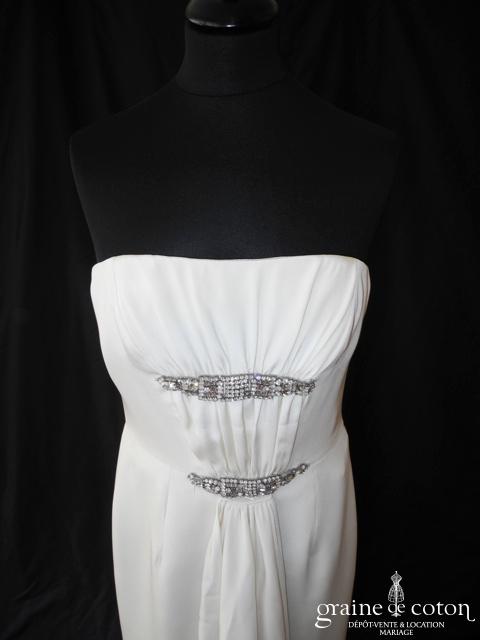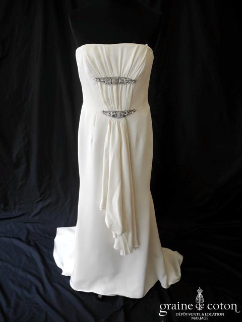 Robe une pièce en crêpe de soie : bustier taille haute orné de strass, drapé de tissu partant de la taille. Jupe légèrement sirène au tombé fluide avec petite traîne. Le drapé n’est pas fixé, il peut être mis ou non suivant le goût de chacune. Pure et élégante, matière exceptionnelle. Housse incluse.