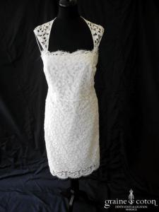 Robe courte en dentelle ivoire clair : bustier avec larges bretelles en dentelle, transparente dans le haut du dos. Coupe droite au genou, fendue à l’arrière. Raffinée et élégante, idéale pour une cérémonie civile.