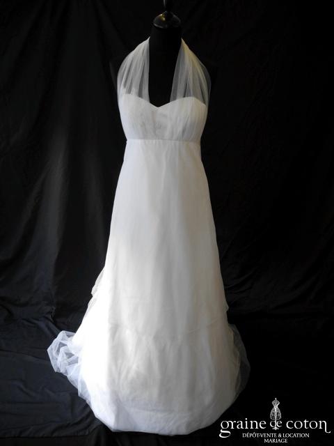 Robe une pièce en satin et tulle blanc : bustier empire avec guipure de dentelle, dos lacé. Deux pans en tulle partent de la taille empire pour se nouer autour du cou. Jupe fluide légèrement évasée en tulle, beau mouvement. Fraîche et facile à porter. Housse et jupon inclus.