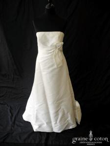 Robe une pièce en mikado de soie ivoire clair : bustier empire souligné d’une large ceinture et d’un beau noeud. Jupe trapèze légèrement évasé avec petite traîne pouvant se remonter par un système de boutons. Sobre et classe. Housse incluse.