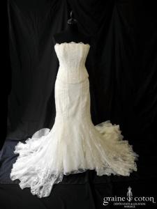 Robe deux pièces en dentelle ivoire : bustier droit boutonné dans le dos. Jupe sirène très évasée avec longue traîne pouvant se relever par un système de lanières/bouton. Une robe pure avec une magnifique matière, tout en élégance et simplicité. Jupon inclus.