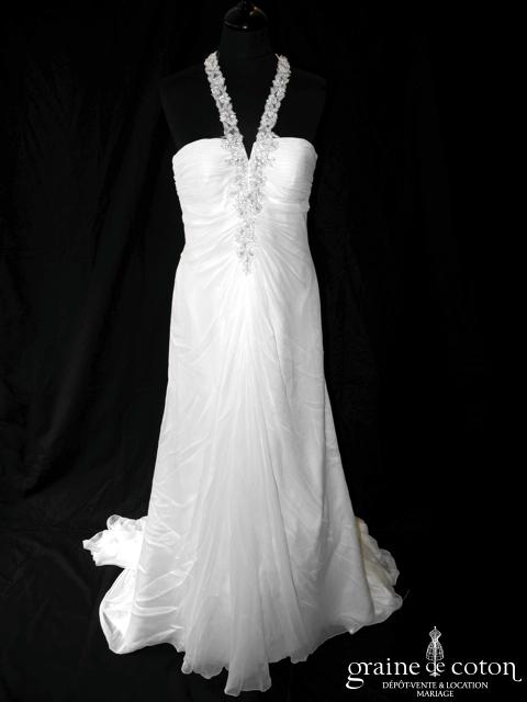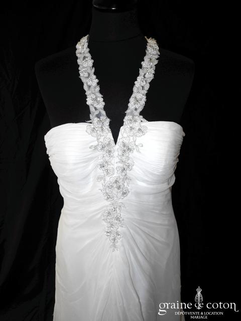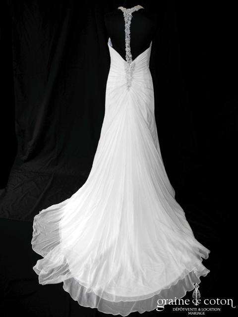 Robe une pièce en mousseline ivoire clair : bustier drapé avec larges bretelles brodées et strassées. Jupe fluide avec longue traîne pouvant se relever. Légère et élégante. Jupon inclus.