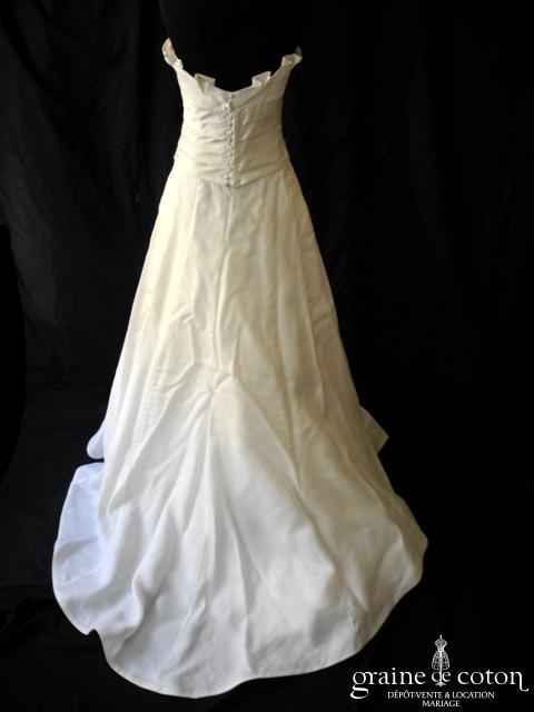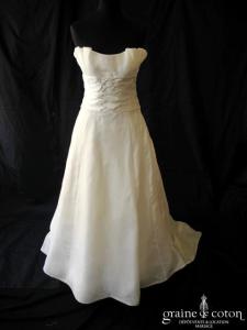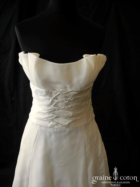 Robe une pièce en soie ivoire : bustier travaillé de noeuds en satin de soie et de gaze plissée, dos boutonné. Jupe en gaze de soie, évasée et épurée. Moderne et élégante. Housse incluse.