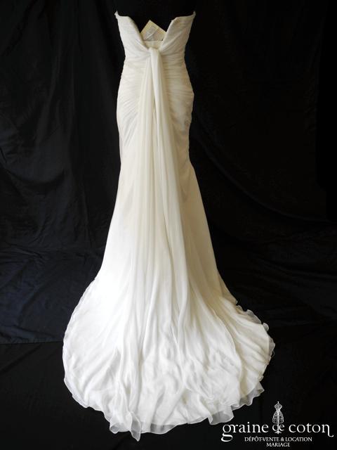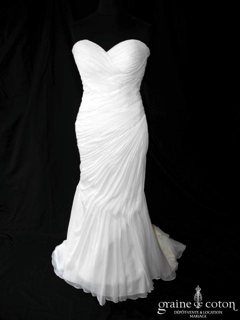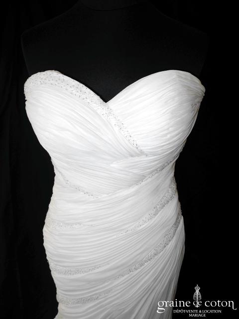 Robe une pièce en mousseline : bustier coeur drapé avec bandes de fines perles. Jupe sirène fluide avec deux pans de traîne partant du milieu du dos. Épurée et classe. Jupon inclus.