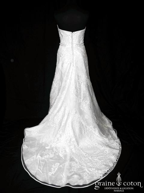 Robe une pièce en dentelle et tulle ivoire clair : bustier taille haute, dos boutonné. Jupe légèrement sirène avec traîne pouvant se relever par un système de rubans. Raffinée et fraîche. Housse et jupon inclus.