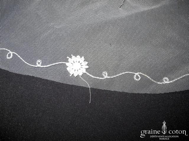 Voile long de 2 mètres en tulle ivoire bordé de fleurs de dentelle