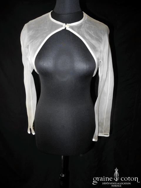 Boléro en organza de soie cappuccino, manches longues trompette, fermeture par un bouton.