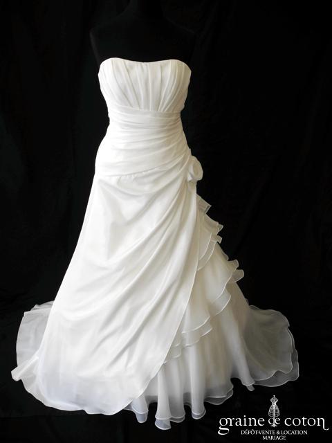 Robe une pièce en taffetas ivoire clair : bustier drapé empire avec fleurs en organza à la taille, dos boutonné. Jupe trapèze évasée ouverte sur des volants d’organza, effet asymétrique. Fraîche, lumineuse et pure.