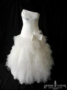 Robe transformable ivoire clair : bustier asymétrique en mikado drapé, dos lacé. Jupe taille basse en mouchoirs de tulle : portée avec les jupons, le modèle est long. Sans les jupons, vous avez une robe courte devant et longue derrière, avec un système de rubans pour attacher la traîne. Moderne, éclatante et élégante !
