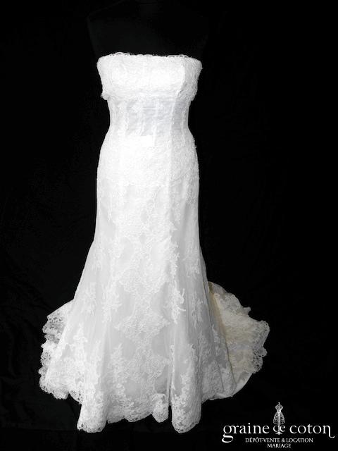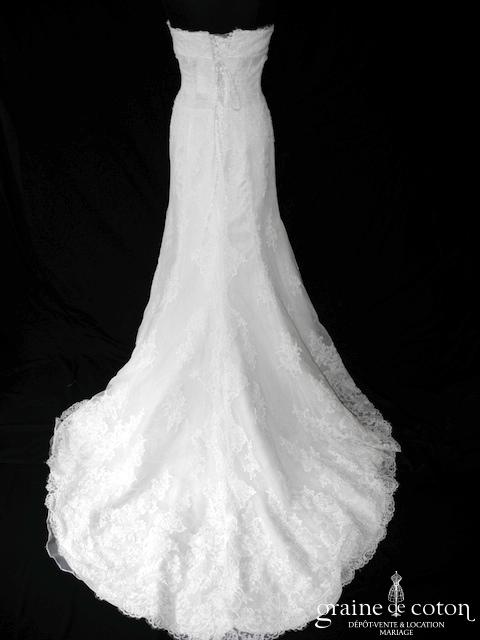 Robe une pièce en dentelle de Calais ivoire : bustier empire, dos lacé avec un ruban d’organza. Jupe sirène légèrement évasée avec longue traîne pouvant se remonter par un bouton et une lanière. Raffinée et seyante.