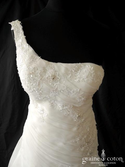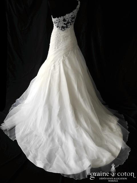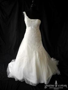 Robe une pièce ivoire clair : bustier drapé d’organza avec une bretelle, dos nu recouvert de dentelle pour un très bel effet. Jupe taille basse évasée trapèze en organza avec traîne. Élégante et raffinée.