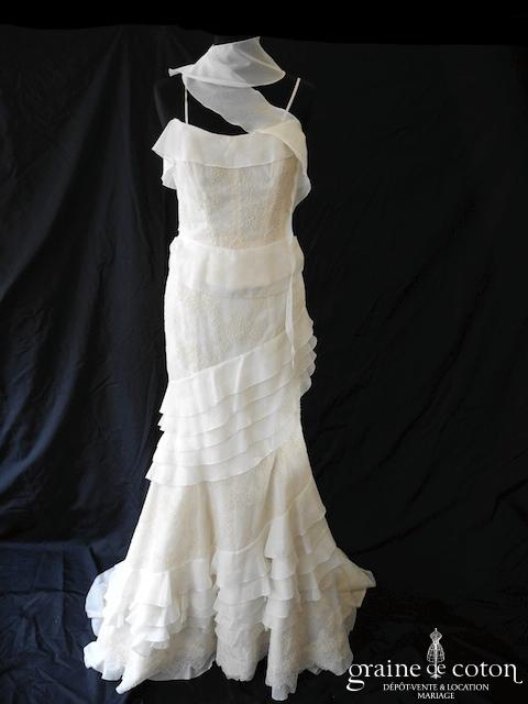 Robe deux pièces en dentelle champagne clair : bustier lacé dans le dos avec fines bretelles amovibles. Volants d’organza pouvant se passer autour des épaules ou bien à laisser tomber sur la jupe. Jupe sirène dans les mêmes matières avec rappel de volants, traîne. Raffinée, délicate et élégante, très belles matières.