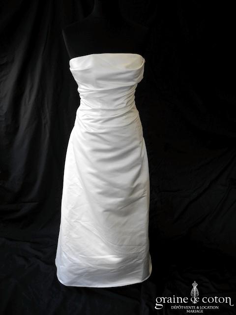 Robe une pièce en satin ivoire clair : bustier drapé lacé d’un très large ruban dans le dos. Jupe sirène peu évasée avec petite traîne ramassée pouvant se relever par un système de rubans. Sobre et très élégante.