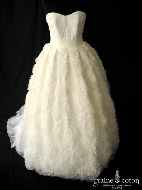 Robe une pièce en organza ivoire clair : bustier coeur drapé avec large ceinture, dos lacé. Jupe façonnée de roses en organza, volumineuse mais légère, petite traîne. Princesse moderne tout en luminosité et légèreté.