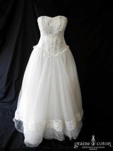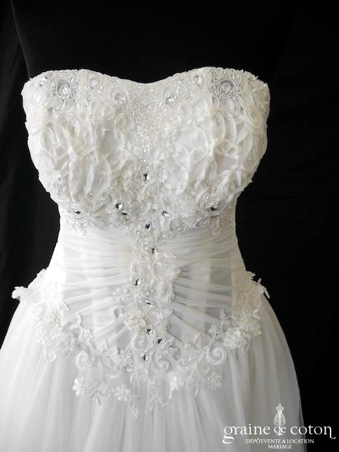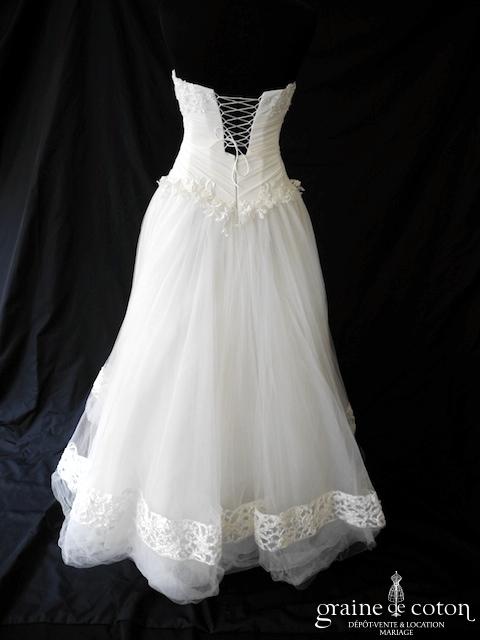 Robe une pièce ivoire clair : bustier coeur en drapé de tulle et guipure de dentelle strassée, dos lacé. Jupe évasée et légère en tulle avec rappel des motifs du bustier sur le bas de la robe, pas de traîne. Moderne et princesse, tout en fluidité.