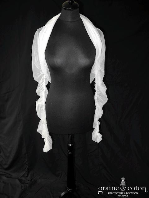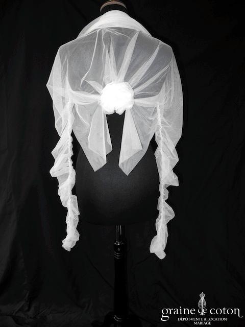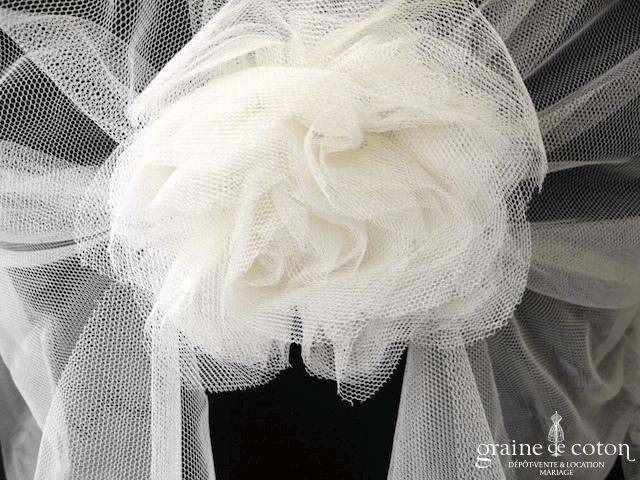 Boléro en tulle ivoire à manches longues plissées, rose de tulle sur l’arrière qui se fixe à votre robe par une pression (fournie).