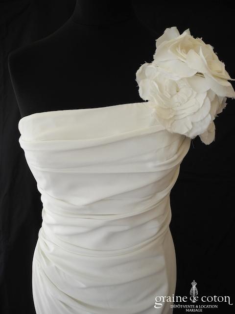 Robe une pièce en crêpe de soie ivoire clair : bustier drapé avec une bretelle ornée de larges fleurs amovibles. Jupe sirène fluide près du corps évasée avec petite traîne pouvant se relever par un système de rubans. Épurée et chic.