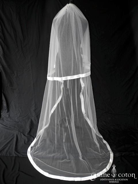 Voile long de 3 mètres en tulle ivoire bordé d’un large bais de satin. Avec rabat avant, monté sur peigne.