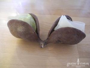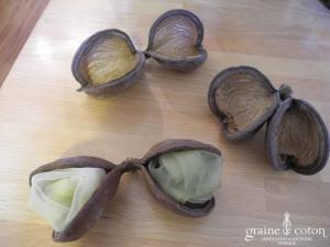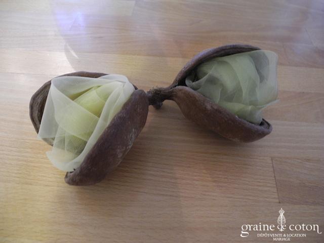 Écorce double pour une déco bio ! Très originale, cette véritable écorce façon bogue triple a été aménagée avec des tissus de couleur. A vous d’imaginer son intégration dans votre mariage ;o)