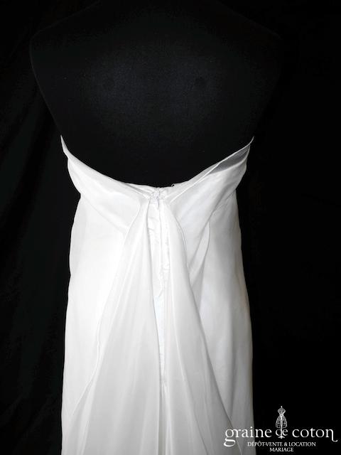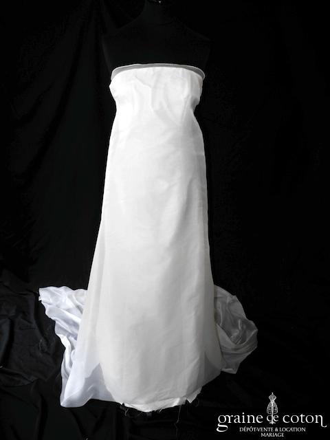 Robe une pièce en organza de soie ivoire clair : bustier droit, taille marquée. Jupe évasée trapèze avec petite traîne. Épurée et classe.