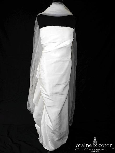 Robe une pièce en taffetas de soie ivoire : bustier droit avec finitions brutes, tissu sans surjet. Découpe asymétrique de la robe façon drapé avec pans arrières de finissant en petite traîne. Jupe longue droite, fendu à l’arrière. Coupe très originale, belle matière. Étole en tulle ivoire incluse.
