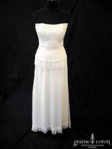 Robe deux pièces ivoire clair : bustier en guipure de dentelle de coton, lacé dans le dos. Jupe fluide en tulle avec la même guipure sur l’ourlet. Sobre, travaillée et élégante.