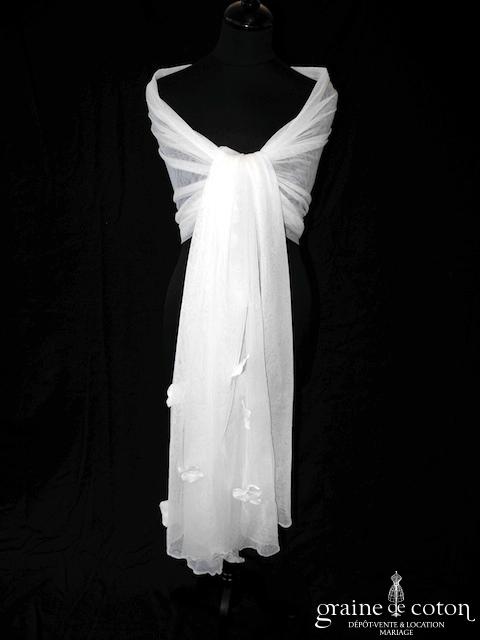 Étole en tulle fluide parsemée de fleurs hawaïennes, fraîche et légère.