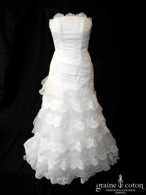 Robe une pièce ivoire clair : bustier en organza drapé, décolleté en dentelle de Calais. Jupe taille basse asymétrique composée d’une alternance de volants en organza et en dentelle, traîne. Lumineuse, fraîche, champêtre.
