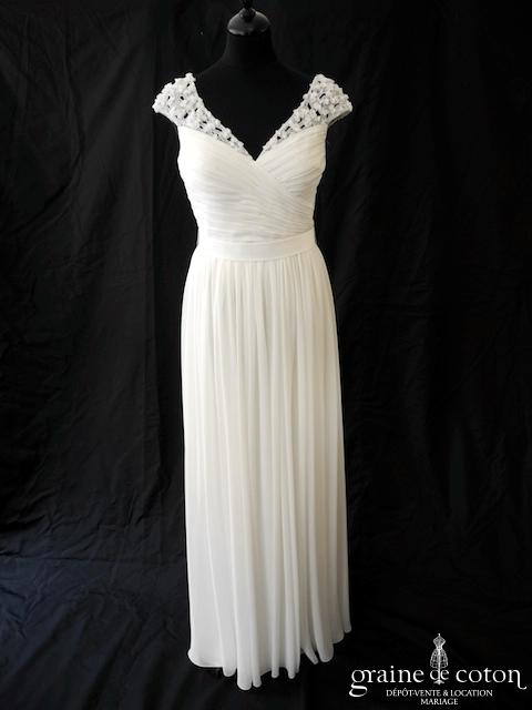Robe une pièce en mousseline ivoire clair : bustier coeur plissé croisé, larges bretelles façon petites manches en fleurs d’organza et perles. Taille haute ceinturée puis jupe fluide épurée sans traîne. Légère, lumineuse, classe.