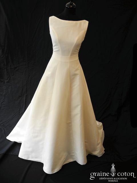 Robe une pièce en ottaman broché ivoire : bustier avec bretelles et encolure bateau, dos boutonné en V. Jupe forme trapèze épurée à l’avant et avec pans tombant en traîne à l’arrière, rappel des motifs brochés du dos. Sobre, classe et structurée.