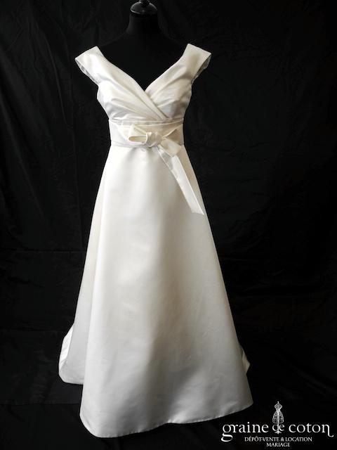 Robe une pièce en satin ivoire clair : bustier avec bretelles sur les épaules, taille empire soulignée d’une ceinture recouverte de guipure de dentelle. Dos nu en V. Jupe trapèze épurée avec traîne pouvant se relever. Un modèle chic et pur.