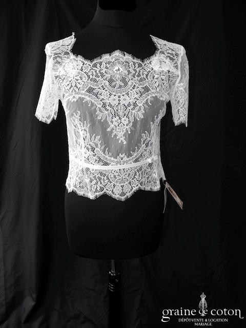 Boléro long à manches courtes en fine dentelle ivoire, petite ceinture en satin à la taille.