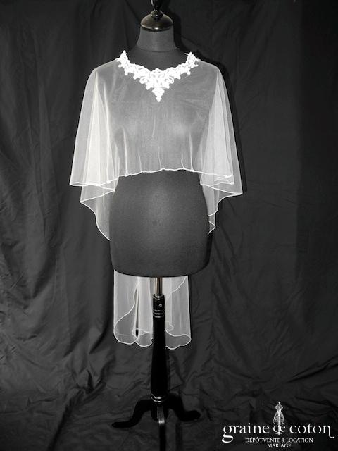 Étole / cape en tulle ivoire clair : encolure bordée de dentelle, longue sur le dos. Classe et originale.